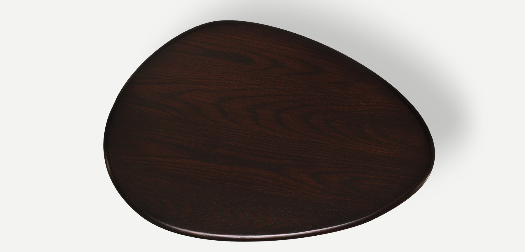 Doğal formuyla uyumlu halde, kenarları da dışbükey doğal zımpara ile şekillendirilmiştir. Ayakların konik hatları, tablaya oturma kaidesiyle bütünlük sağlamaktadır.