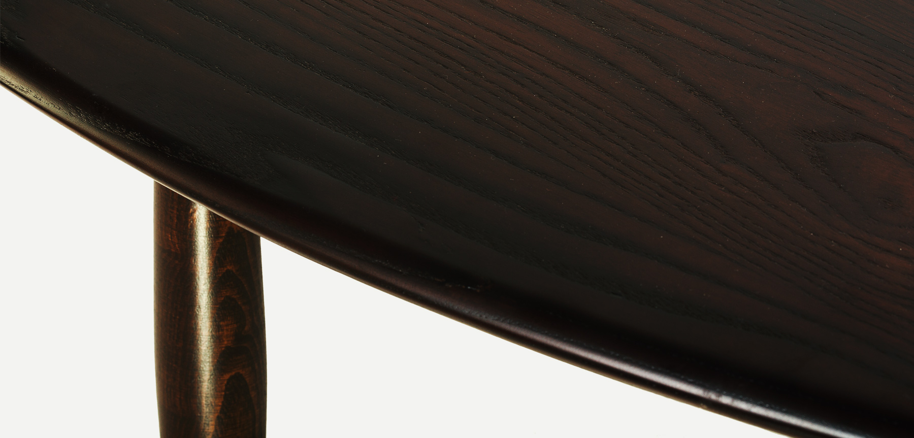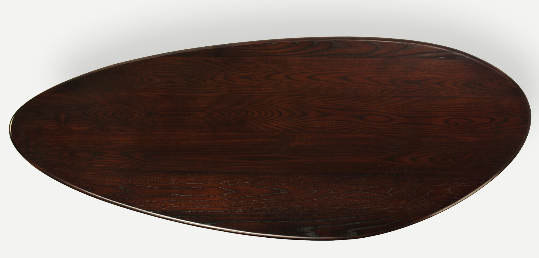 Doğal formuyla uyumlu halde, kenarları da dışbükey doğal zımpara ile şekillendirilmiştir. Ayakların konik hatları, tablaya oturma kaidesiyle bütünlük sağlamaktadır.