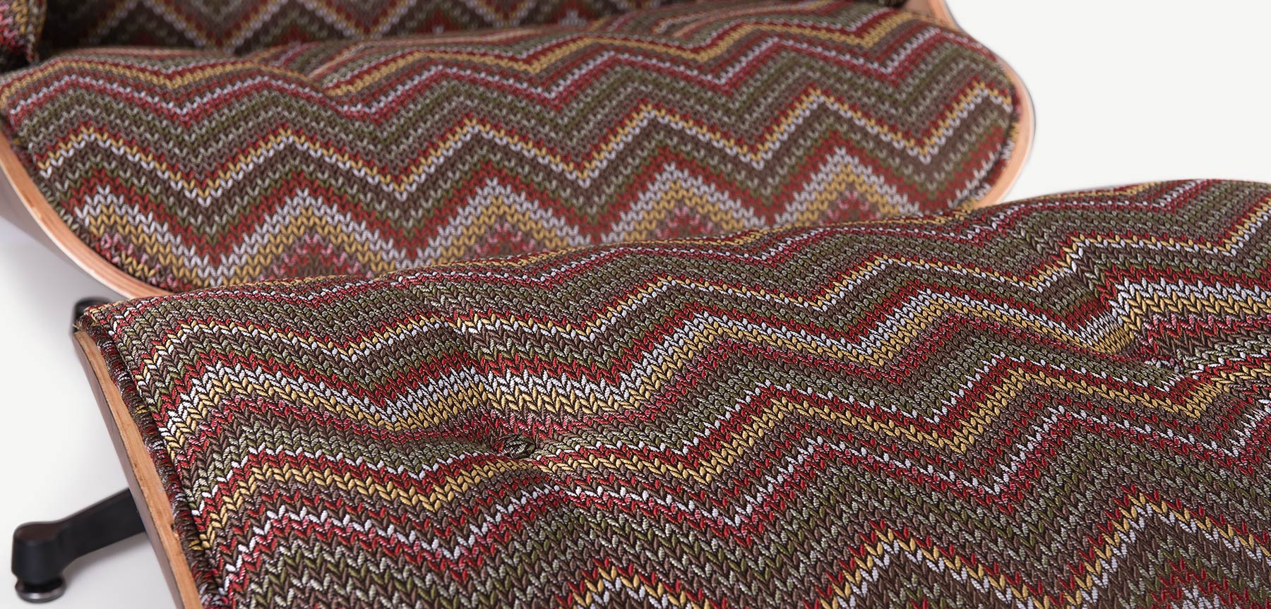 Örgü Missoni kumaşı ile Lounge Chair'a etnik bir hava kattık. Etnik zig zag Missoni deseni Charles & Ray Eames'in efsanevi tasarımı ile birleşince eklektik bir ürün ortaya çıkmış oldu.