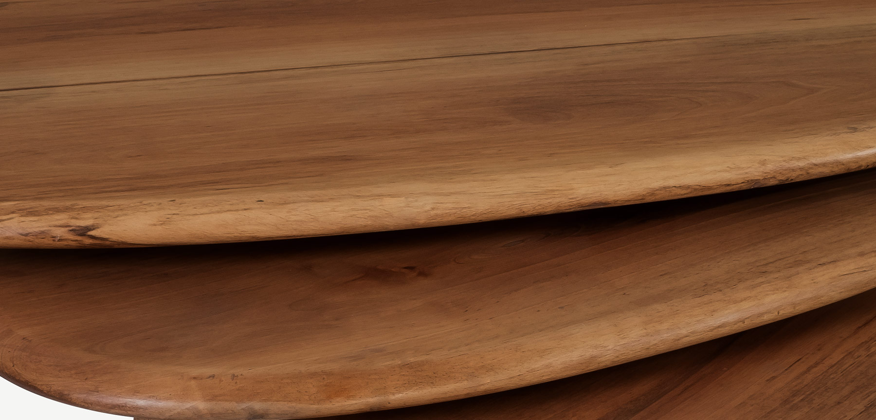 Doğal formuyla uyumlu halde, kenarları da dışbükey doğal zımpara ile şekillendirilmiştir. Ayakların konik hatları, tablaya oturma kaidesiyle bütünlük sağlamaktadır.