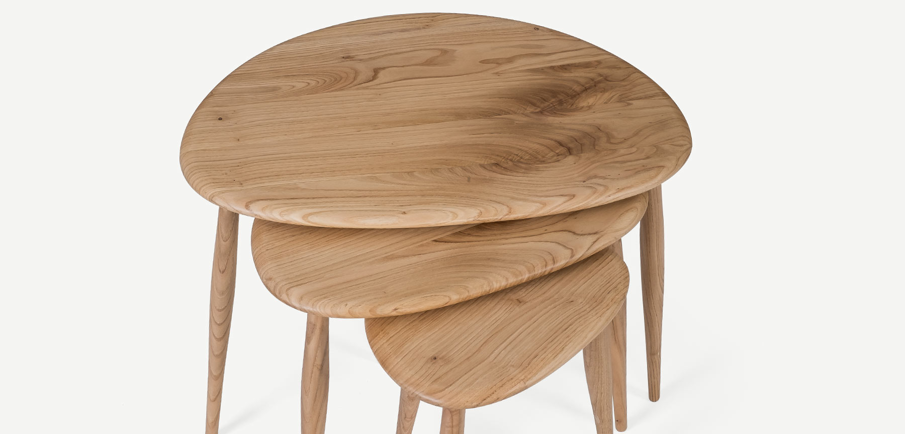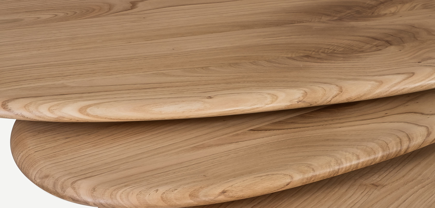 Doğal formuyla uyumlu halde, kenarları da dışbükey doğal zımpara ile şekillendirilmiştir. Ayakların konik hatları, tablaya oturma kaidesiyle bütünlük sağlamaktadır.