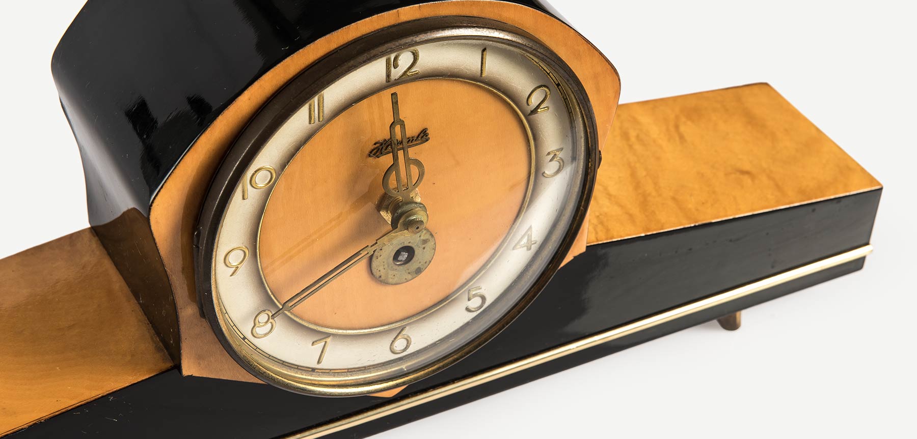1950'lerden kalma bu zarif şömine saati, kurma kolu ile ön yüzünden kurulmaktadır. Aksamı sorunsuz çalışır durumda. Yine de bakım gerektirmektedir. Dekorunuza geçmişin zarafetini ekleyin.