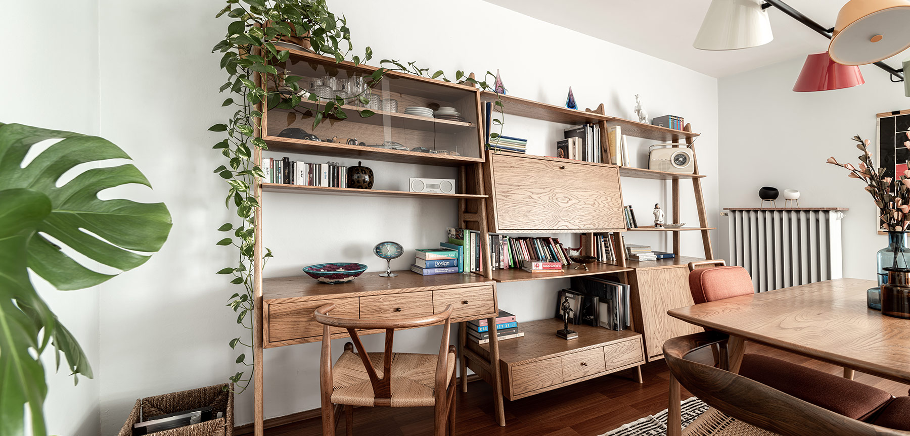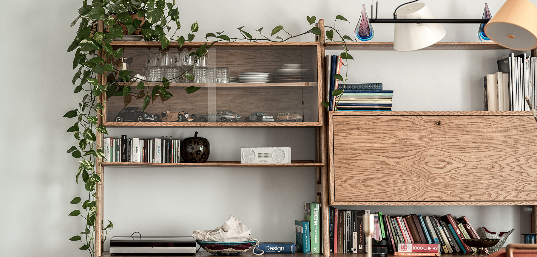 Açılı yapısı sayesinde mekanın hacmini yemediği gibi, farklı yükseklikteki raflarıyla çok kullanışlı.Uğur Şayan