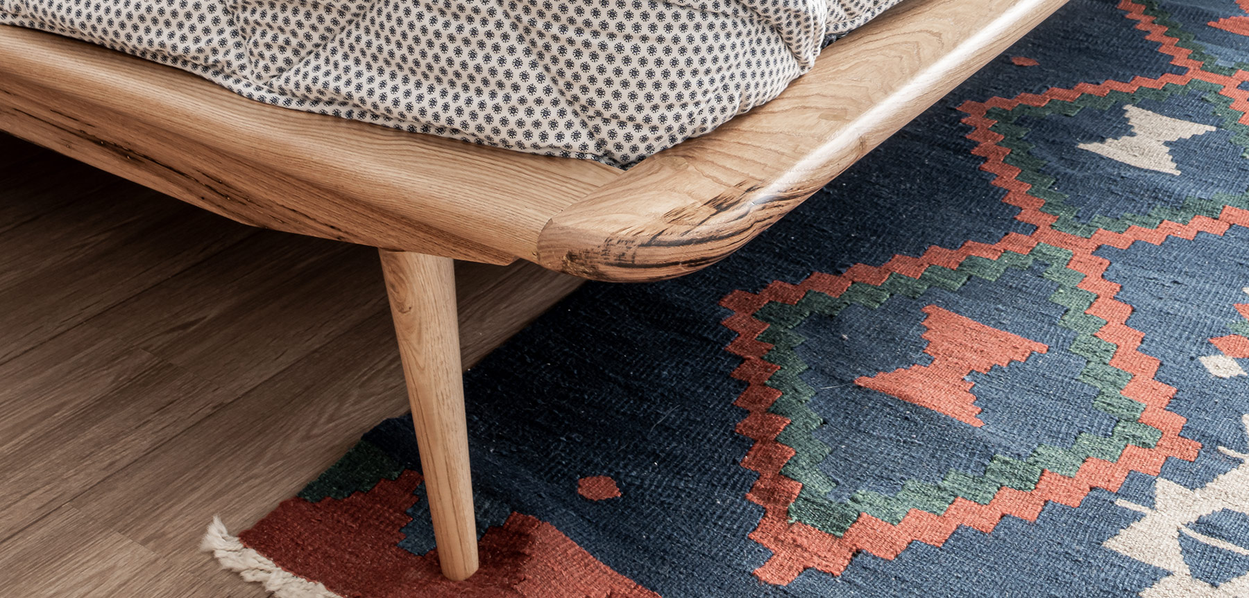 Kenar bordürleri ile daha akıcı detaylara sahip olan karyolamız komple masif malzemeden yapılma olup sırt kısmı masif kaplama ile tamamlanmıştır.